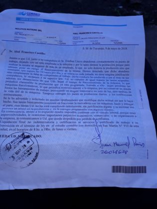 Enrique Ibarra, Secretario de Prensa del STIA Tucumán, explicó al portal de noticias gremiales, que desde el gremio consideran los despidos como una acción persecutoria por parte de la empresa. «Esta es la primera elección de Delegados que se hizo desde que en la empresa se cambió la firma (antes era La Española). Les enviaron una carta documento a los compañeros, apenas se hizo la elección y al día siguiente no les permitieron la entrada», precisó Ibarra.