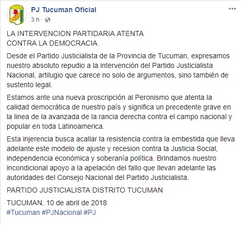 Allí, la máxima autoridad partidaria a nivel provincial hizo una defensa de su gestión administrativa, criticó la intervención, reivindicó su pertenencia al kirchnerismo y anticipó que el normalizador Luis Barrionuevo podría decidir intervenir el PJ Tucumán.