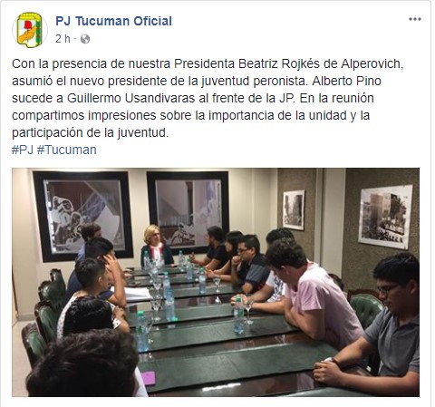 La todavía Presidenta del Partido Justicialista Distrito Tucumán, Beatriz Rojkés de Alperovich mantuvo, en la sede partidaria, un encuentro con dirigentes de la Juventud Peronista durante la tarde de ayer . Con el motivo del cambio de autoridades en la cúpula de la JP (el joven Alberto Pino asumiría la presidencia en remplazo de Guillermo Usandivaras), un grupo de militantes dialogó con la ex Senadora sobre la actualidad del PJ a nivel nacional, tras la intervención del partido decretada a instancias de un fallo de la Jueza Federal María Romilda Servini de Cubría.