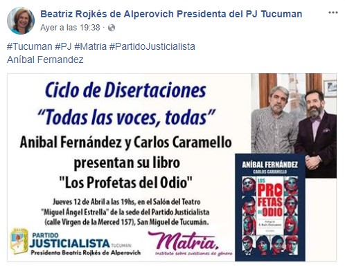 “…Nosotros tenemos la tranquilidad de que nuestro partido está funcionando con excelencia, debe ser el único distrito del país que está en esas condiciones. Hemos presentado balances, y memorias y todo lo que corresponde; y si en algún momento el compañero Barrionuevo dice que nos interviene tenemos que entregar la chequera, la llave y los libros… esto puede pasar…”, expresó la impulsora de la visita que mañana realizará a la sede partidaria Anibal Fernández, con la excusa de presentar un nuevo libro de su autoría.