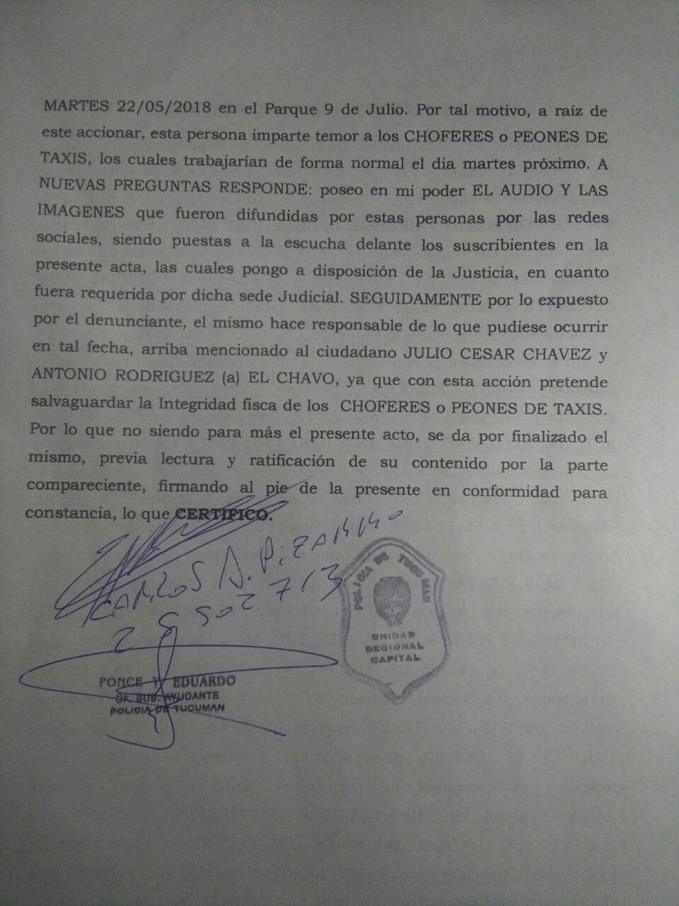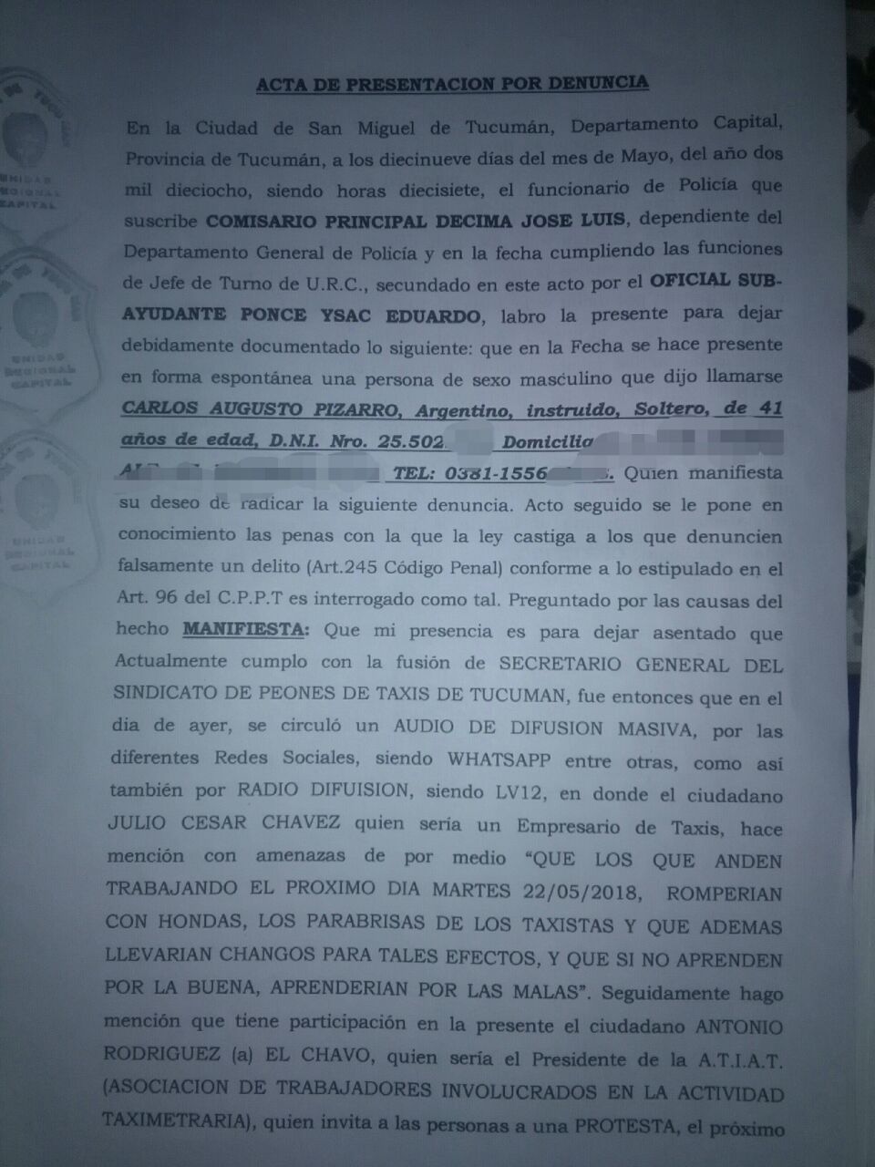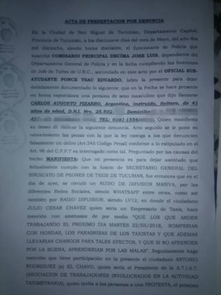 No obstante, en los últimos días se han viralizado una serie de audios, que generaron preocupación por el fuerte contenido de violencia y las amenazas explícitas que allí se proclamaban. Por tal motivo, el Secretario General del Sindicato de Peones de Taxis, concurrió ayer a la Unidad Regional Capital, para denunciar al Empresario de Taxis, Julio César Chávez, y Antonio «El Chavo» Rodriguez, quien sería el presidente de ATIAT, por las presuntas amenazas viralizadas por Whatsapp contra los peones de taxis que pretendan trabajar el día de la protesta.