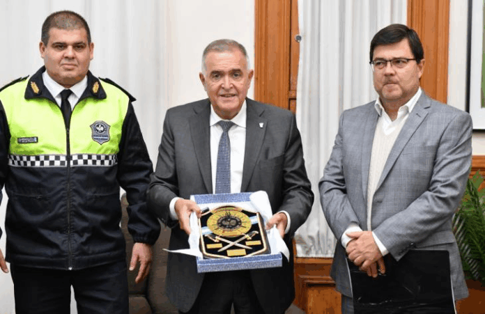 El gobernador Osvaldo Jaldo recibió esta mañana en su despacho al ministro de Seguridad, Eugenio Agüero Gamboa y al jefe y subjefe de Policía, Joaquín Girvau Olleta y Roque Yñigo, quienes le entregaron varios obsequios por el cumpleaños del Primer Mandatario, el pasado 19 de abril.